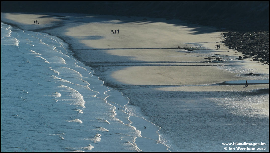 At low tide, large areas of sand are uncovered on Laxey beach.