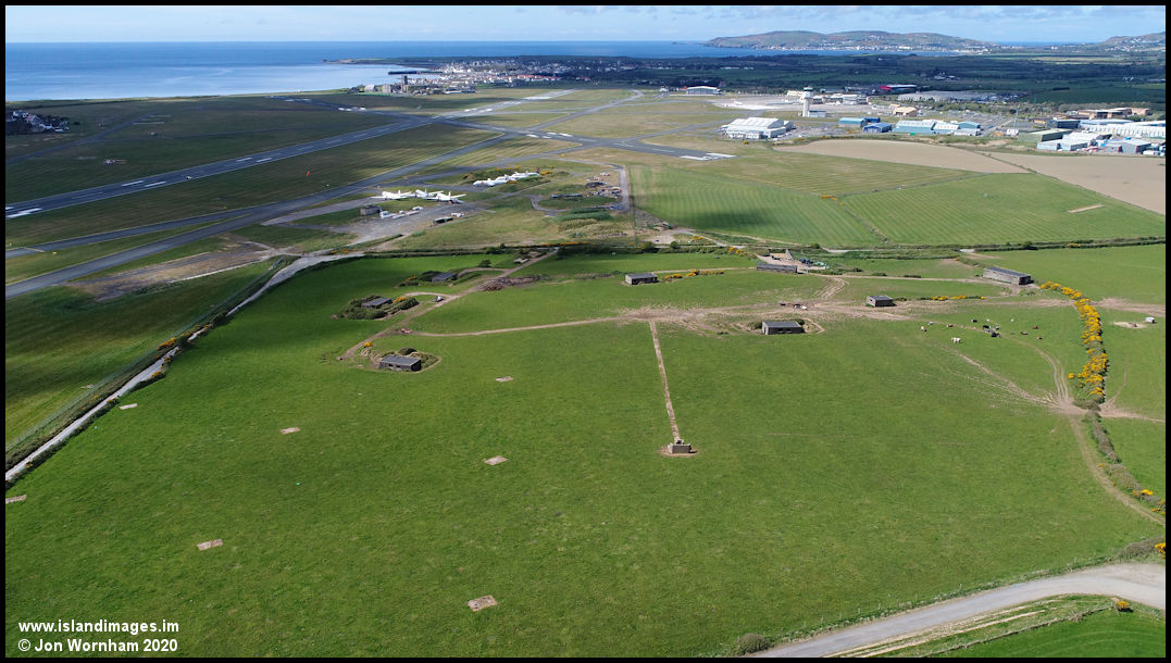 An aerial view of the HMS Urley Explosives Area, taken while the airport was closed in 2020. All buildings well separeted from each other.