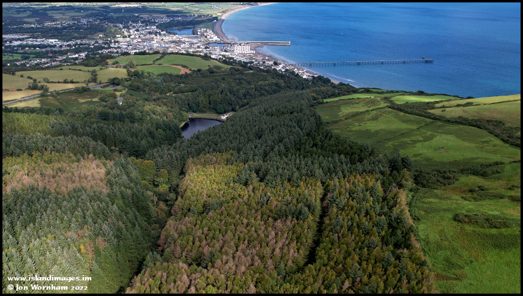 Another single view grap from a panorama sequence, with patterns of light and shade on the trees of Ballure Plantation, with Ramsey beyond.