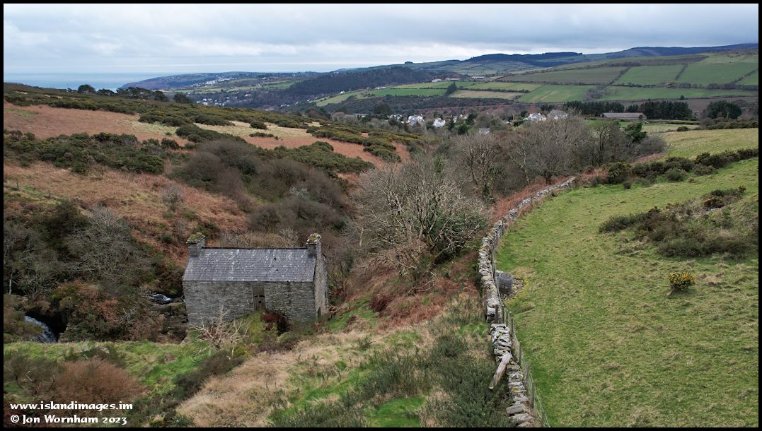 A low level view past the old North Shaft winding house towards Agneash village. The actual shaft was filled in and is underneath the rough area on the right.