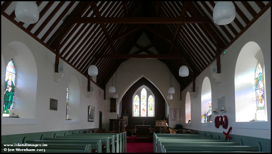 The church interior, quite plain and functional, but with some ornate stained glass windows.