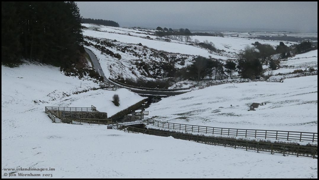 This was taken from the top of the reservoir dam, looking down to where the road twists across the valley. Conditions were getting quite unpleasant with wet snow falling and I was heading back to the car.