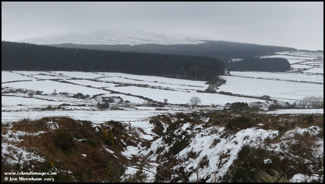 This is looking back across the valley, Cringle Reseroir is hidden in the plantation trees and the summit of South Barrule hidden by cloud or falling snow.