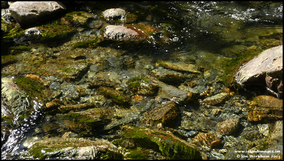 The clear waters of the Laxey River bubble over and around rocks.