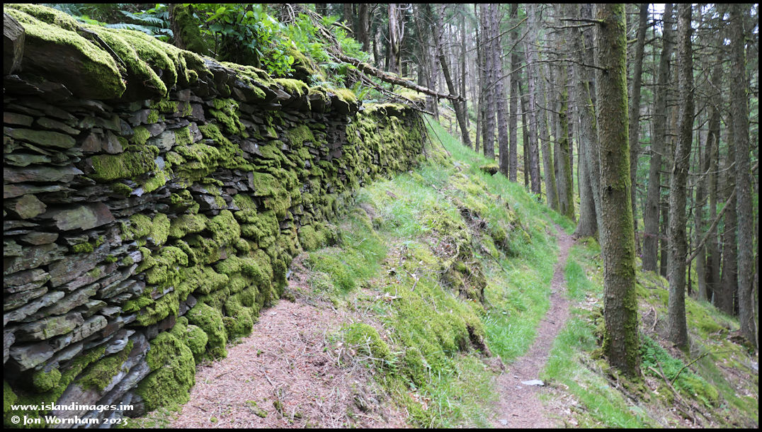 It had started to rain gently not long after I took the last picture, so I'm trying to find a short cut up to the higher forest track by following this pathway below an old stone wall.