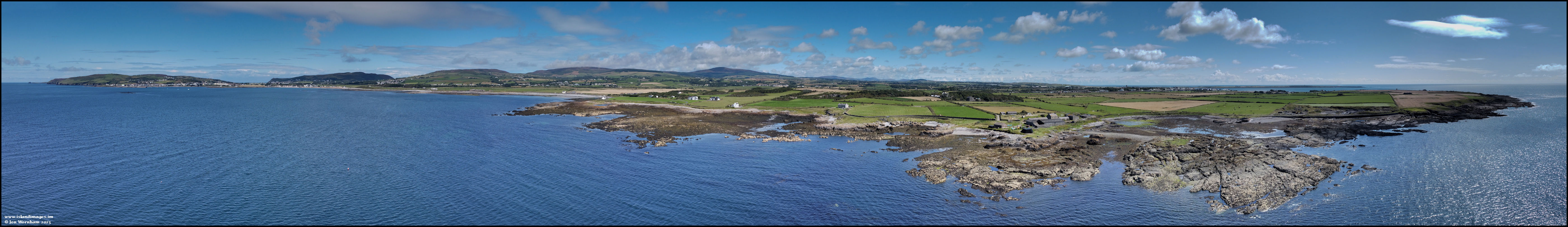 A stitched linear panorama, looking from The Chasms and Port St Mary on the left, then across Bay-ny-Carricky and past Pooilvaaish to Scarlee on the right. Shot from around 150ft over the sea.