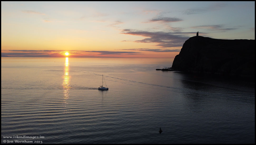 A yacht enters the bay as the sun lays a golden path across the sea.