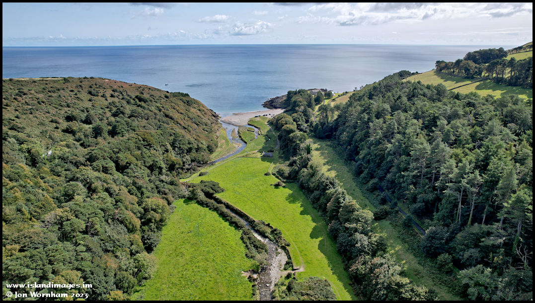 I've flown up the valley a little to shoot a panorama, this is looking back to the beach. Again, a nice colour contrast, between the varied greens of the land areas and the blues of sea and sky.