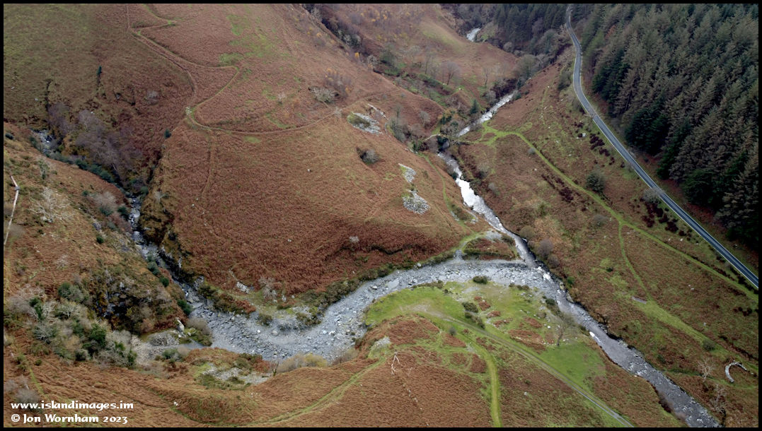 Confluence of the Block Eary stream and Sulby River. The old green lane up to Ballaskella can be seen zig-zagging up the hillside after crossing the river on an old stone bridge, mainly hidden by trees.