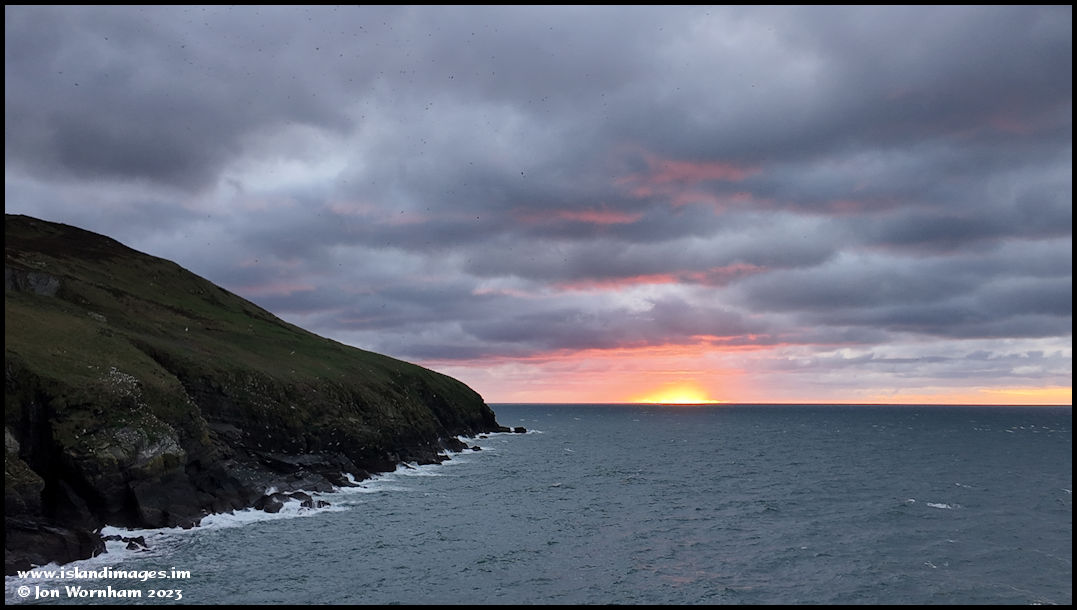 The setting sun was painting some lovely colours on the the bottoms of the clouds. That's Peel Hill on the left and the dots are gulls wheeling around.