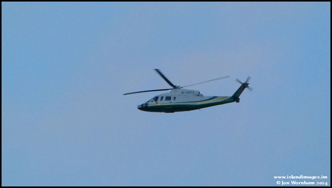 'Monty', a resident of Andreas and on the Manx Aircraft Resister, passing by. I hope they have good noise cancelling headsets as I could hear it coming way before I coud see it! (It's a Sikorsky S76)