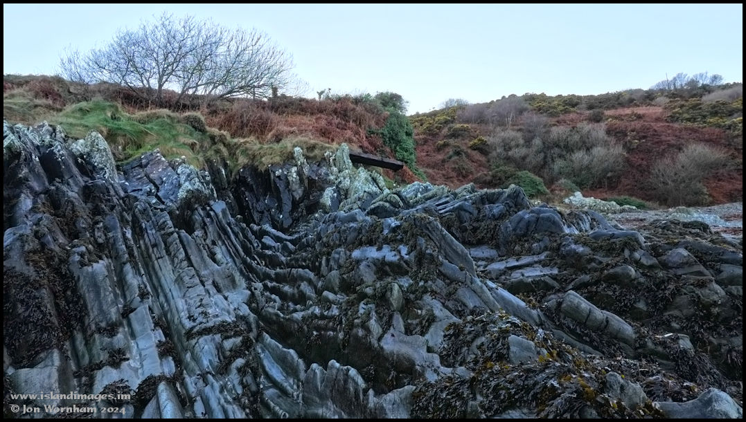 Sea eroded rocks on the south side of the beach. The platform sticking out above was at the end of a path down from Howstrake Holiday Camp. A long gone set of steps allowed campers to access the beach.