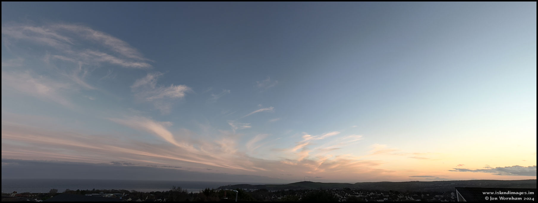 This first sunset was with the Osmo P3, using its 180 degree panorama mode but subsequently cropped on each side. The original had huge horizon distortion which I've mostly managed to correct. Click the image to see the uncorrected version!