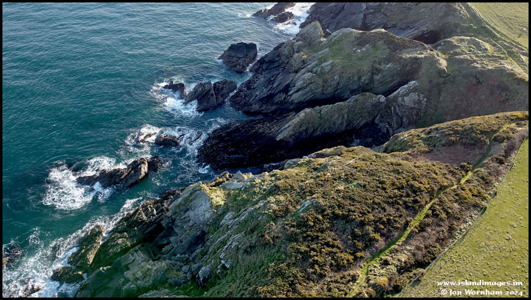 Water swirls around the rocks at low tide. The coastal path can be seen bottom right.