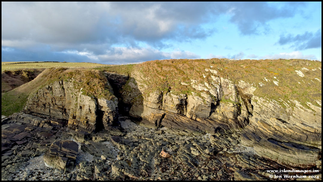 Dropping down to a lower level over the rocks. The boiler that can be seen on the rocks is either that of the 'Argo', wrecked here in December 1905, or one of two that she was carrying as a cargo.