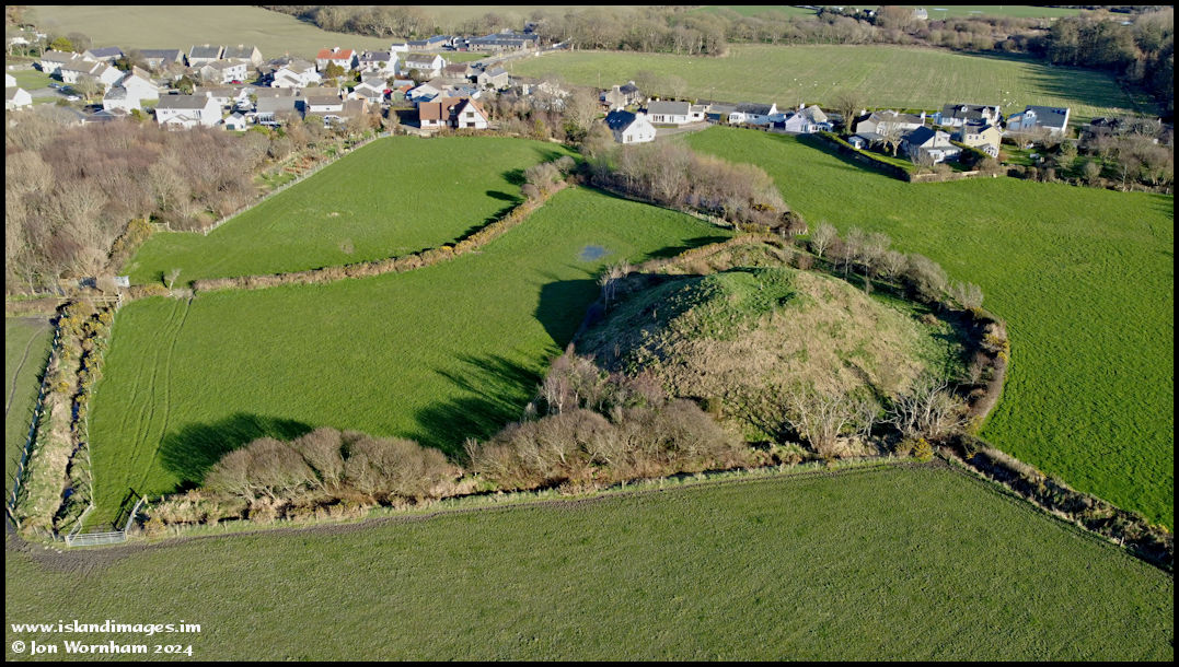 Flying the drone in a circular pattern around the hill to include the houses of Ballafesson behind.