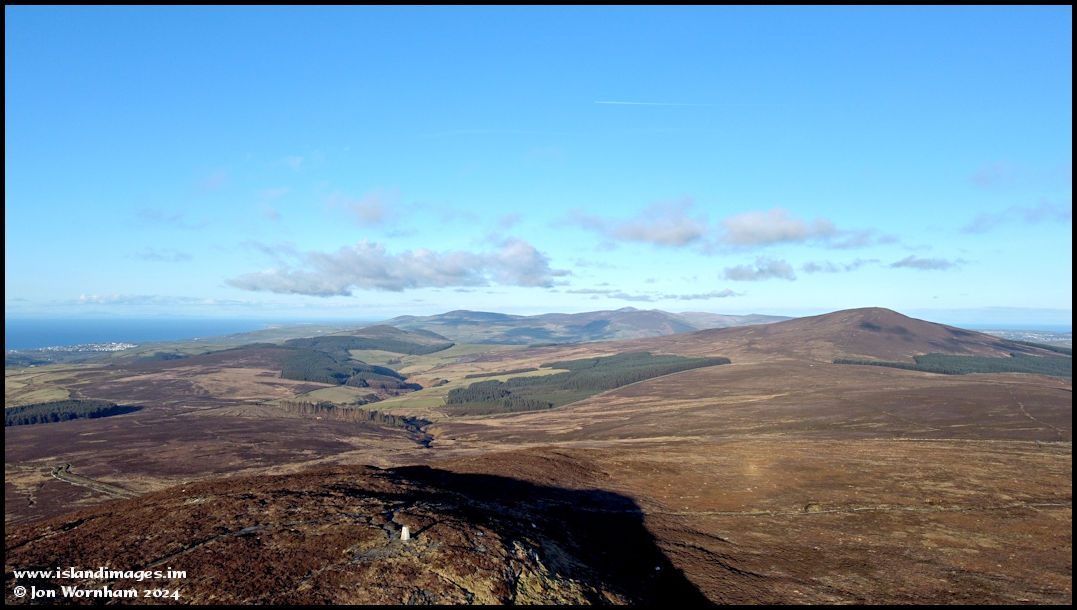 The first attempt at a panorama failed due to the wind, but I salvaged a couple of individual shots from it. This is looking past the trig pillar to Glen Rushen and South Barrule.
