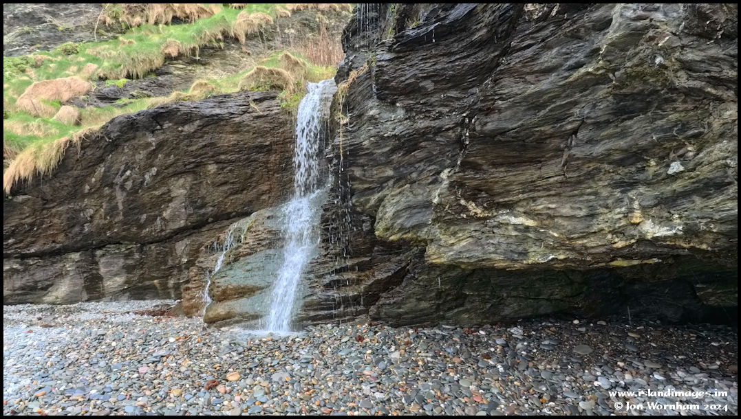 A little waterfall where a stream cascades down rocks at the back of the beach.