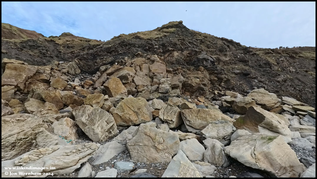 From a distance these rocks look like man placed rock armour to prevent erosion, but when you get up close it's obvious that they have just fallen down from the cliffs above.