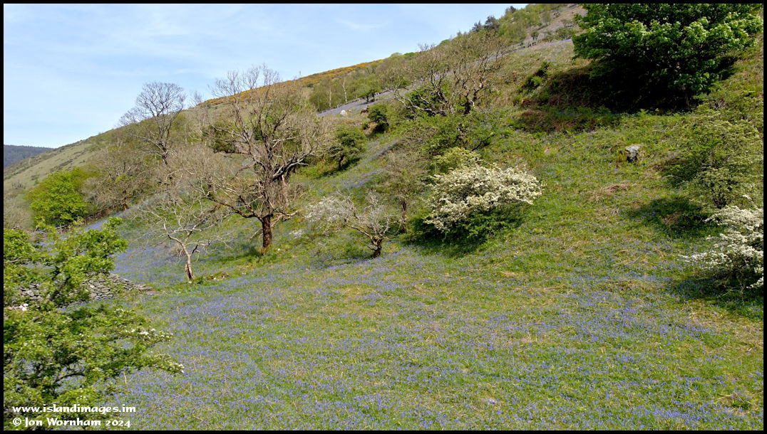 Flying over to the far side of the river, where there are large quantities of bluebells growing on the hillside between the trees.