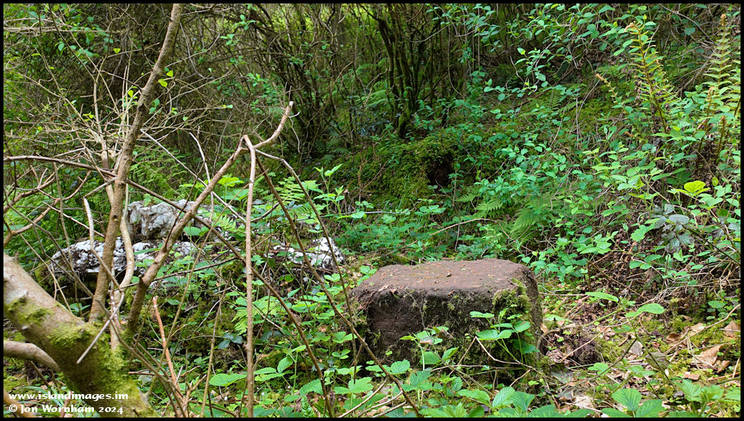 I suspect that this brown stone, looking very similar to the Wishing Stone, might have been at the centre of the maze, together with the large quarts rock behind it. The remains of the maze can be seen extending up the glen side behind.