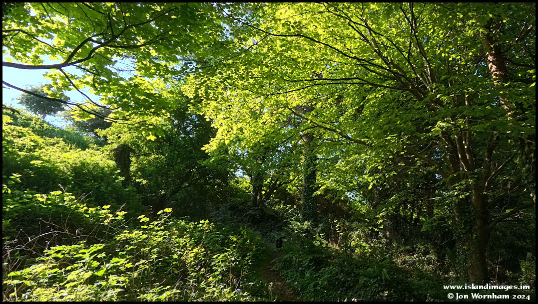 Sunlight filtering through bright green tree leaves on the climb back up to the higher section.