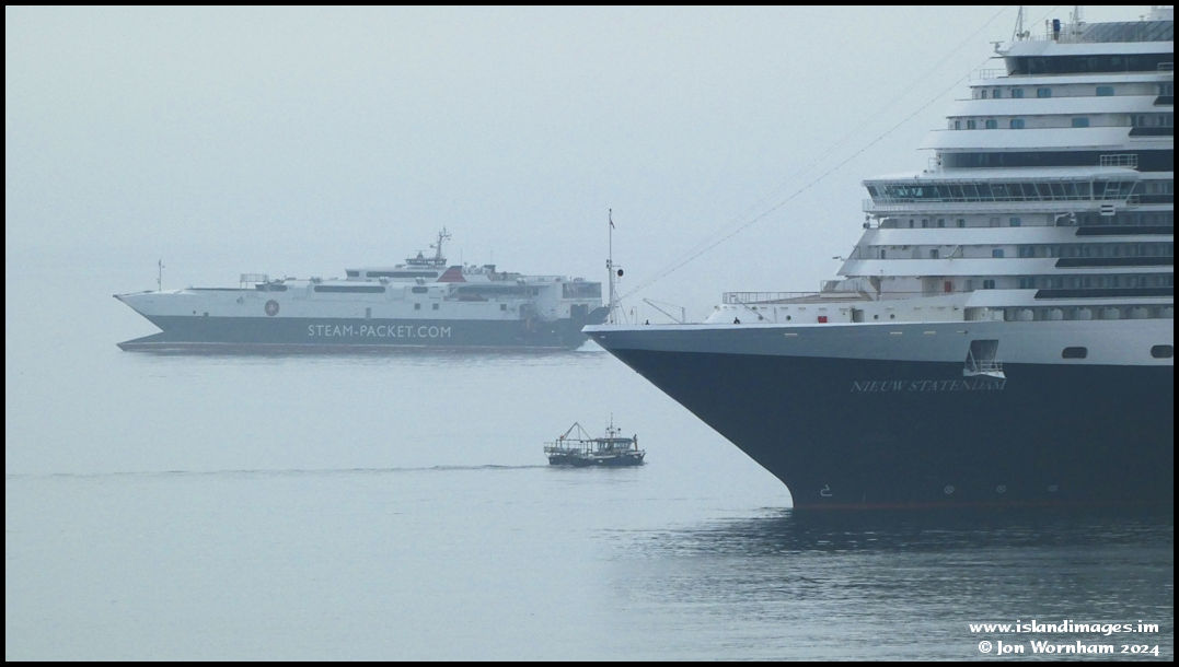 The Steam Packet's 'Manannan' heads out to use the new terminal at Liverpool for the first time with passengers, as a local lobster potter heads inward past the 'Nieuw Statendam'
