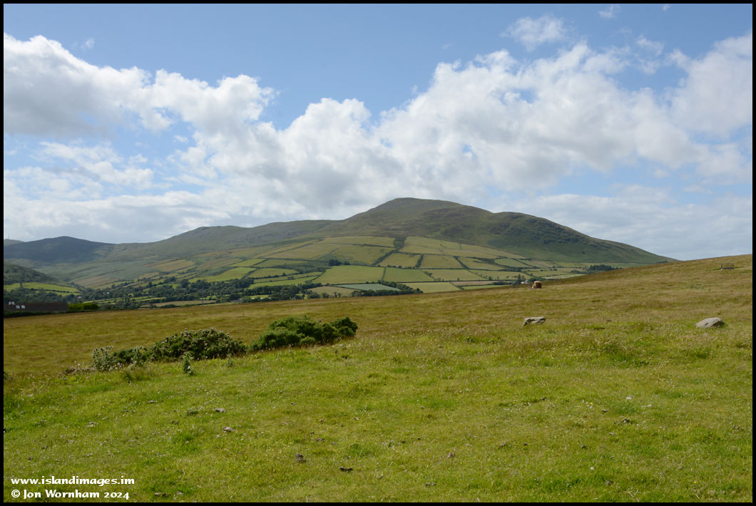 Part of the view from the seat, looking across the fileds to the upper Cornaa Valley and North Barrule.