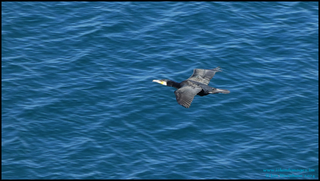A Cormorant flies low over the sea.