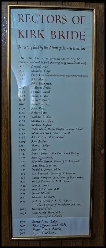 List of the Rectors of Kirk Bride, going back to 1188, the top entry was translated (by Google Translate) as 'Lawrence is Brigid's safety person'.