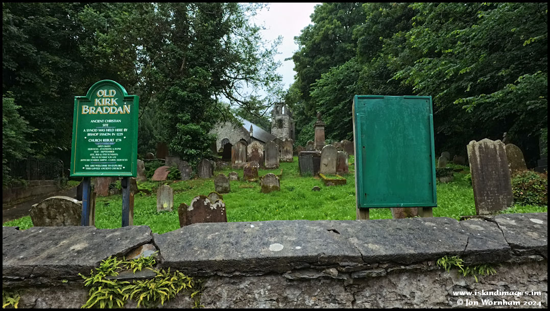Braddan old church from the main Douglas to Peel road side. According to the sign, a synod was held on this site by Bishop Symon in 1229.
