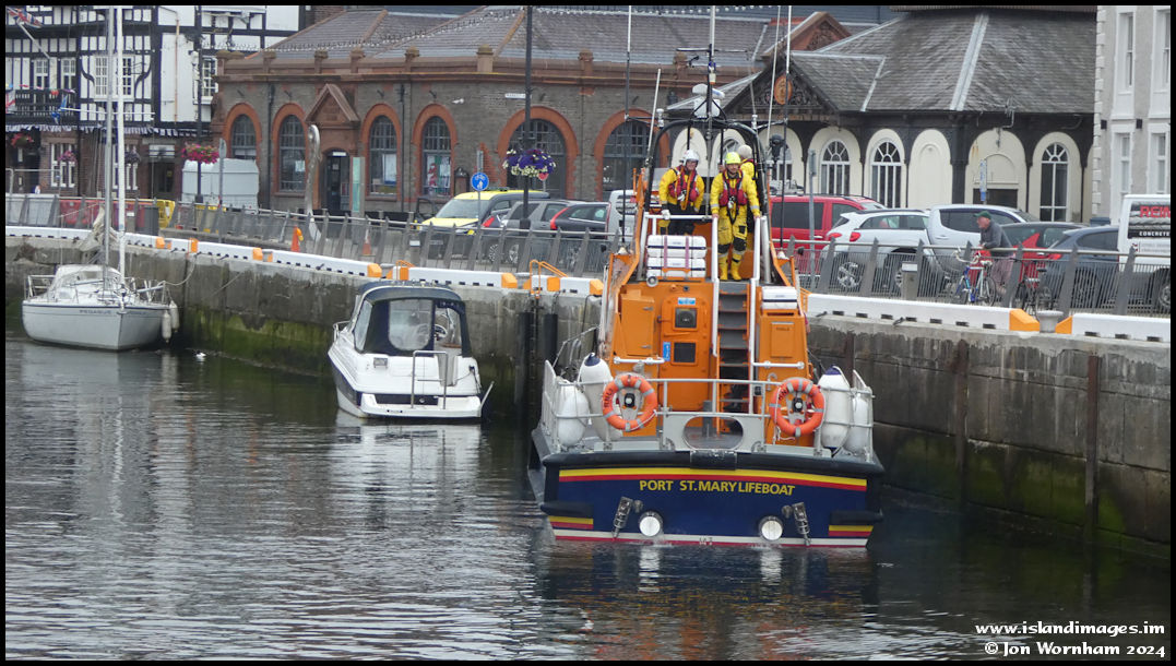 Port St Mary lifeboat at the North Quay, with the rescued casualty moored on the quay ahead of them.