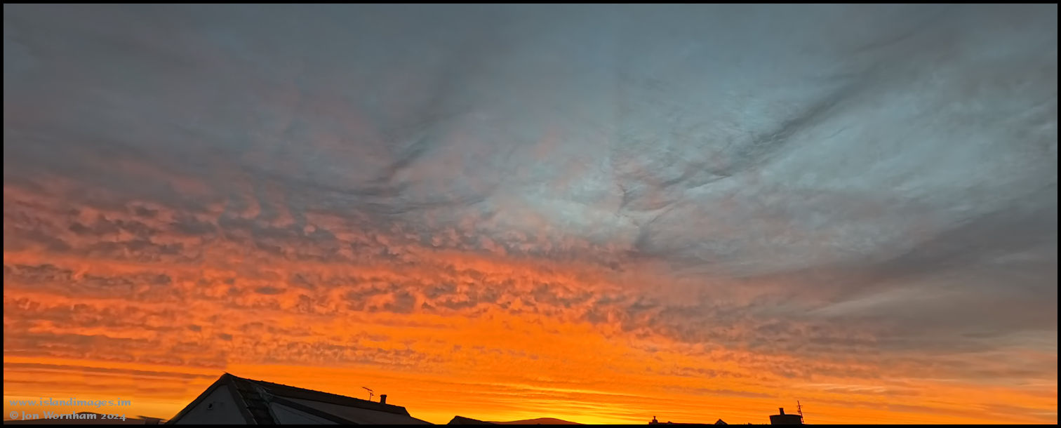 21:03 and looking west through the (open) Velux window. The bright oranges are fading overhead and within around ten minutes the whole sky would just be shades of grey.