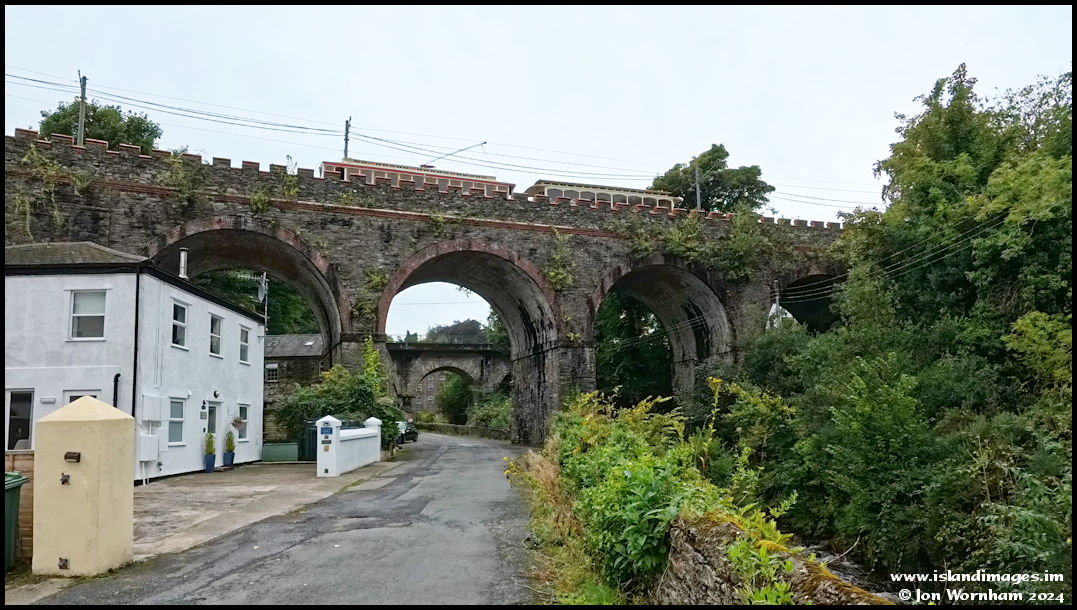 The separate viaducts that carry the railway and road across the valley here, with a Manx Electric Railway tram and saloon trailer crossing overhead.