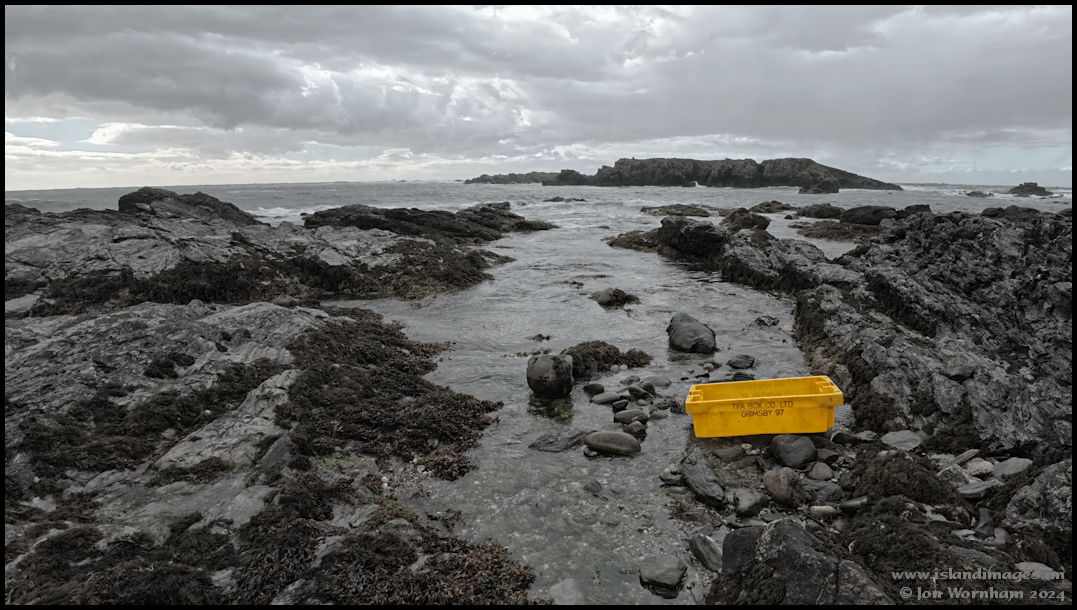 A fish box washed up on the rocks. Surrounding de-saturated to highlight it. I would have retrieved it but couldn't see how to get to it without getting my feet wet!