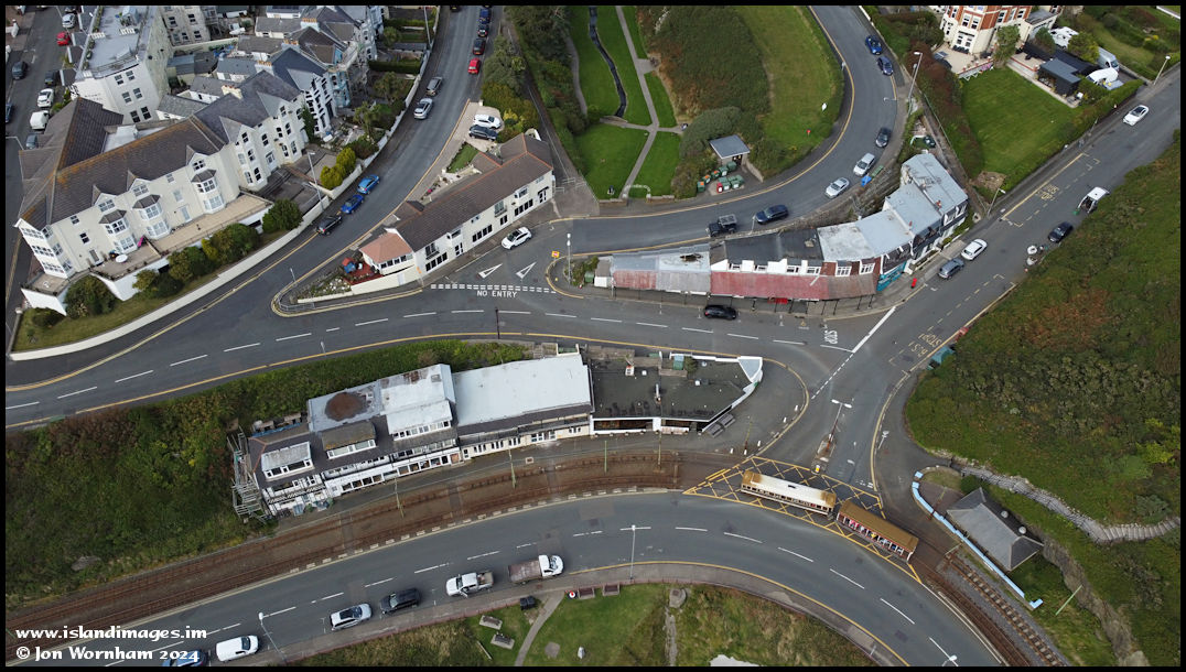 A vertical view looking down to Port Jack, with a Manx Electric Railway tram and trailer crossing the road, heading down to the Derby Castle terminus.