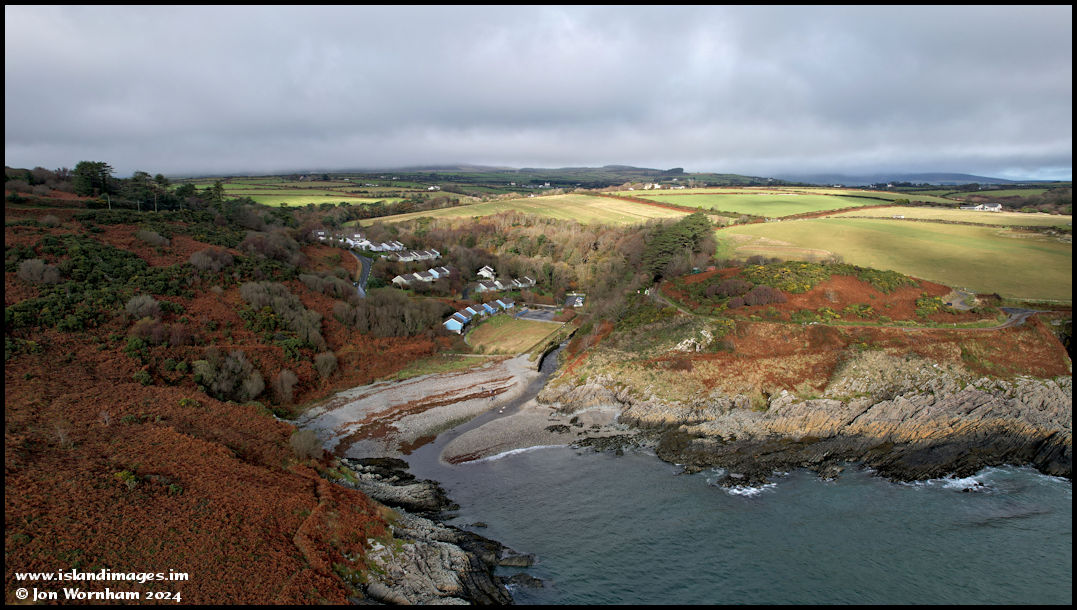 Flying out over the south headland and looking back to the beach, with a patch of sunlight illuminating the fields but low cloud obscuring the hills beyond.