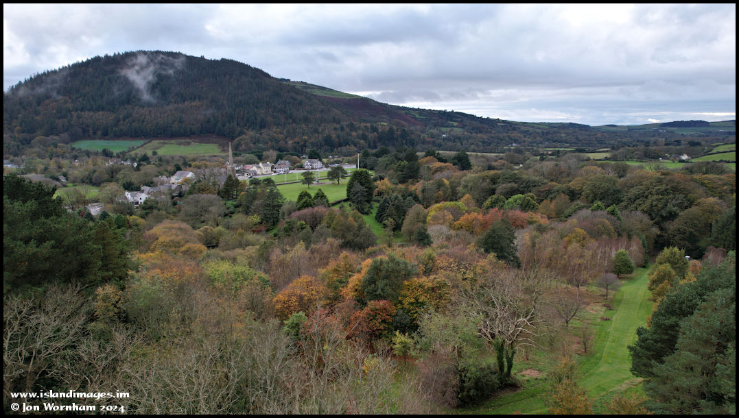 A low level picture just above the treetops, but from the high point of the arboretum, looking across the Tynwald field to Slieau Whallian, with wisps of could drifting past the hill.