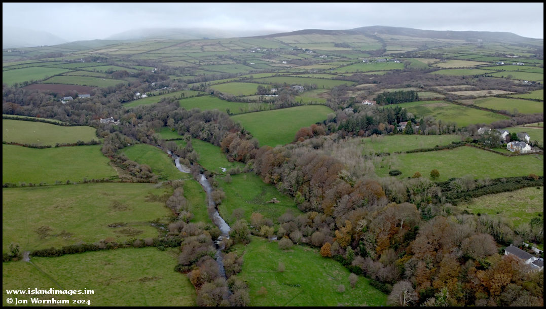 Just to the north of the oakwood the River Glass runs throuh a shallow valley on its way from its source near Injebreck to the sea at Douglas. Low cloud is obscuring most of the hills.