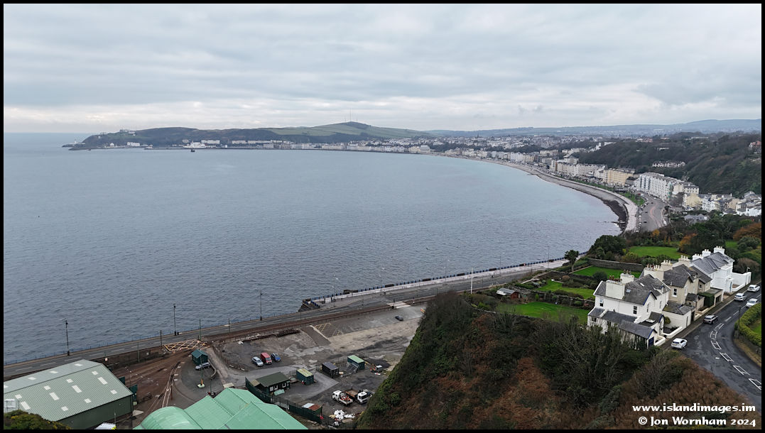 Looking over the Manx Electric Railway depot at Derby Castle and across the bay to Douglas Head.