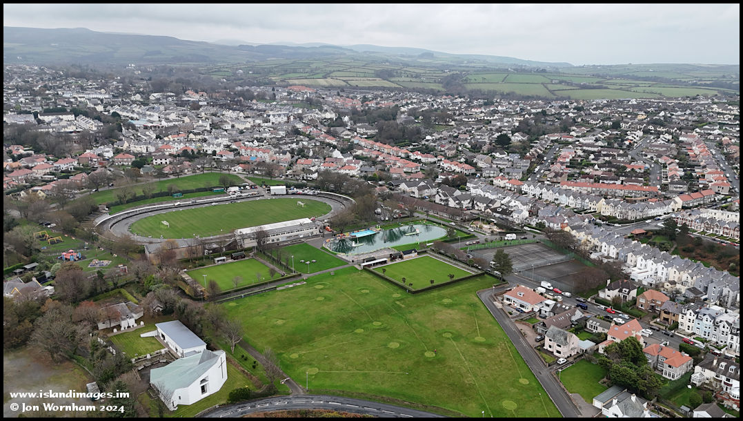 Looking inland now and across the Onchan Pleasure Park towards the older part of the village.