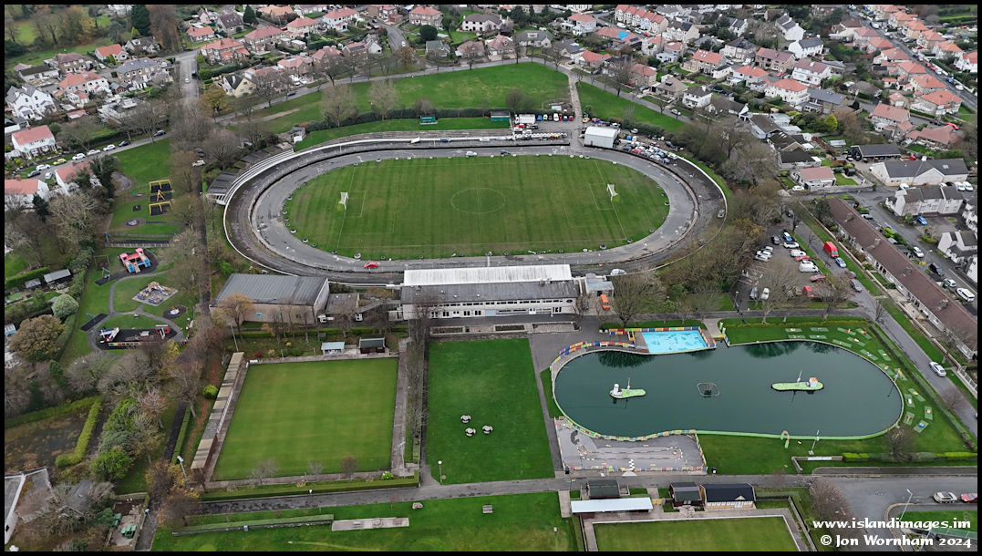 Looking down to the bowling green and boating lake with the motor racing circuit (and football pitch!) behind.