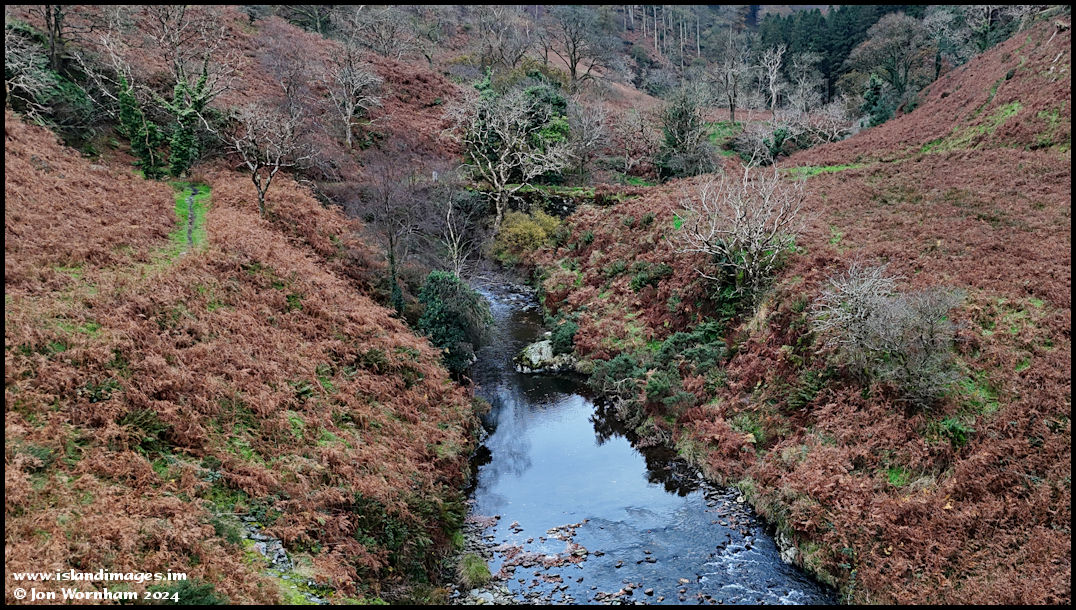 Looking upstream at low level to where an old pack horse type bridge crosses the Sulby River, giving access to the tholtan of Ballaskella, around 300 ft up above river level.