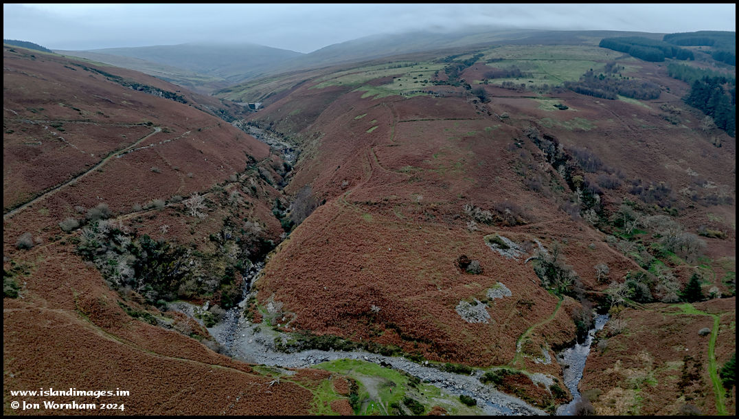 Where the Block Eary valley joins Sulby Glen. The tholtan of Ballaskella is top centre of the picture an you can just about trace the course of the green lane leading up to it from the old bridge through the dead bracken.