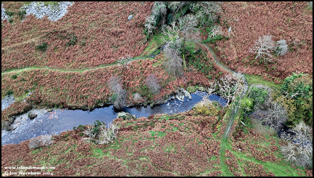 A vertical view looking down to the old stone bridge aacross the Sulby River.