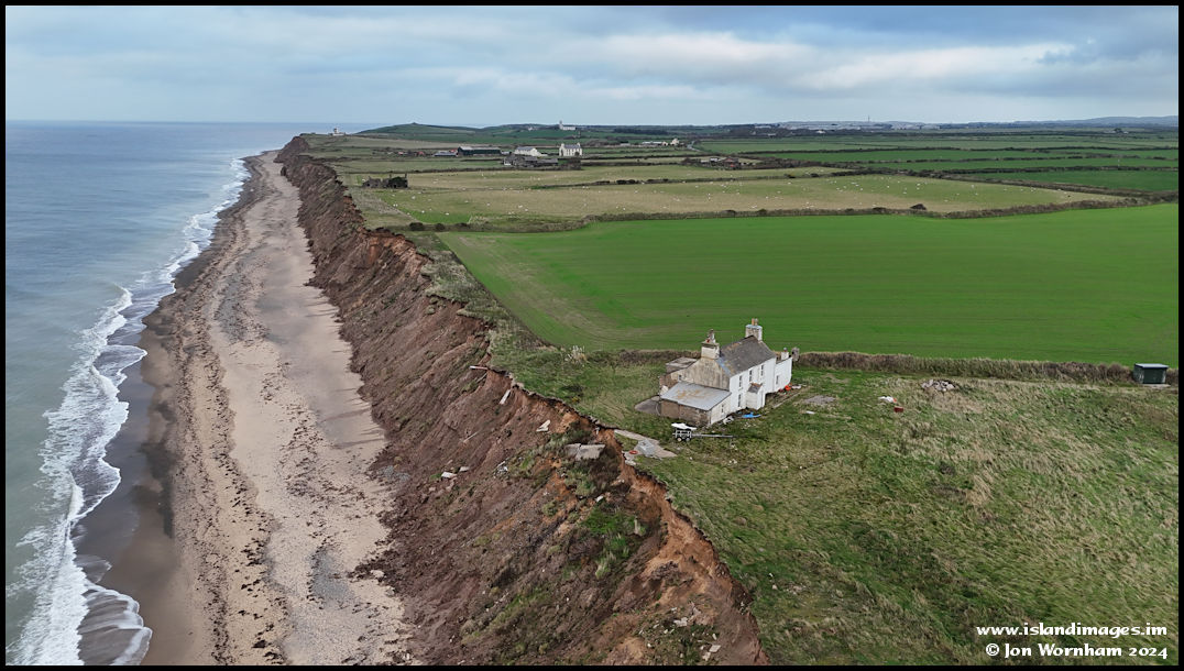 The house at Ballateare, now precariously close to the cliff edge. A large barn even closer was demolished some years ago, but you can see where pieces of it's concrete base have fallen over the edge.
