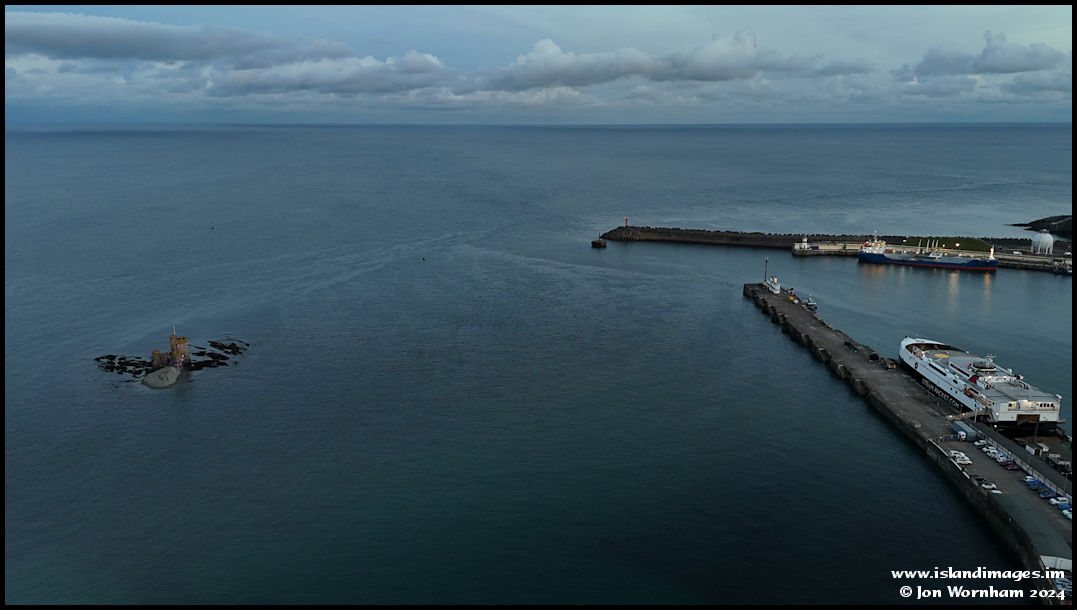 The Victoria and Battery Piers with the Tower of Refuge on the Conister Rock. Ship in harbour were the Steam Packet's 'Manannan' and gas tanker 'Gale'.