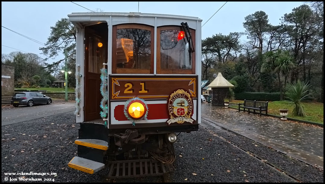 Car No 21 with headboard proclaiming its 125 years of age, being delivered to the line in 1899 for the opening of the Laxey to Ramsey section of the railway.