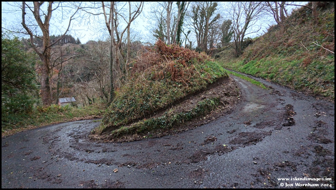The lane up is steep, narrow and twisting, it looks like somebody has driven something here that was too long to negotiate the bend and cut up the bank badly.