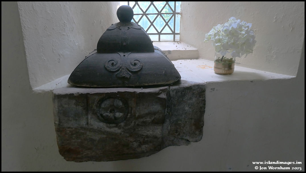 The Christening Font. The cover is more modern, but the actual font is of unknown antiquity. It has an interesting inscription in Manx Gaelic on the right, for more information can I refer you to Peter Killey's excellent